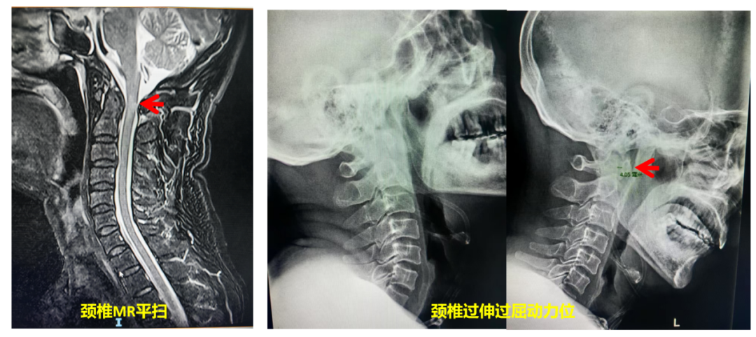 直到最近一次晕厥摔倒后,王先生出现了四肢麻木乏力的症状,为诊断提供了关键线索。王先生在朋友介绍下来到了广州医科大学附属第二医院(简称:广医二院)脊柱外科就诊,经验丰富的任辉博士敏锐地捕捉到这一变化,并通过颈椎过伸过屈位动态检查,最终揭示真相:王先生的晕厥根源是寰枢椎不稳(第1颈椎与第2颈椎之间的关节不稳定),此次外伤后颈髓挫伤也更明确了责任节段。
