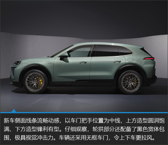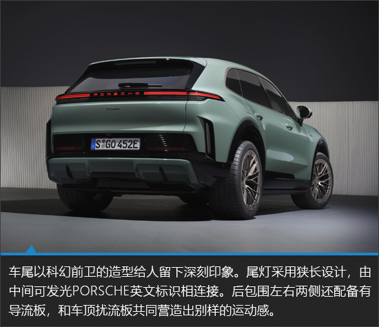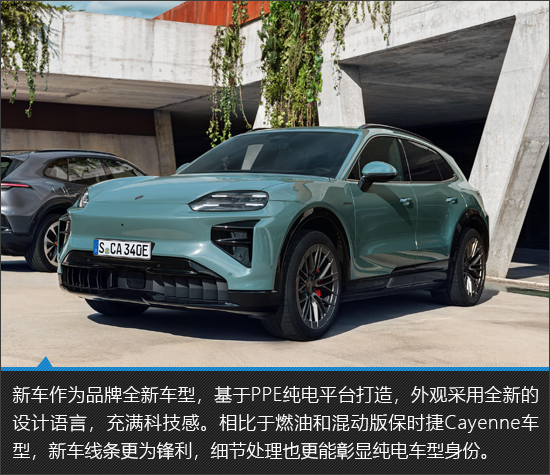 相比于目前国内在售的燃油、混动版保时捷Cayenne车型,新车整车外观可谓进行了大刀阔斧地改变。封闭式前脸和一体式尾部扩散器设计,彰显出车辆的纯电身份。在空气动力学表现上,新车不仅在车头配备了主动开闭式进气格栅,并且车尾两侧也设置了两个半隐藏式的可伸缩导流板,高速行驶时可以提供更好的车身稳定性。尺寸方面,新车长宽高分别为4985mm*1980mm*1674mm,轴距达到3023mm。